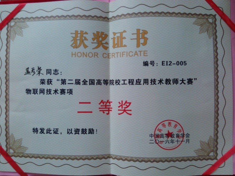 2016年11月10—13日,第二届全国高等院校工程应用技术教师大赛决赛在浙江大学紫金港校区举行。在物联网技术创新设计与应用项目竞赛中,我院盖彦荣老师的“智能家居系统的设计与实现”方案设计荣获二等奖。