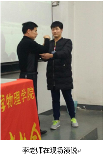 在主持人的开场演说之后,李伟老师便登台开始了他生动有趣又实用的讲解。首先,李老师用亲身经历的两个被骗案例提醒同学们提高自己的防范意识。之后,李老师与几位志愿者合作为大家现场演示了被锁喉后的多种解脱方法、被抓住手腕后的解脱方法、不同季节应对坏人攻击的方法等。在师生互动的欢乐气氛中,大家学到了很多实用的防身方法。