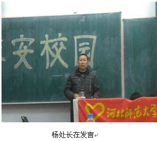 这一环节过后,便是由杨处长为同学们带来的安全主题教育。杨处长精心准备了多页演讲稿,向同学们细致讲解了当今大学的安全现状,将安全问题归纳为了四大类。之后杨处长又向同学们介绍了一些社会上的安全问题,同时,他多次嘱咐同学们要时刻保持警惕心,否则危险来临时再亡羊补牢却为时晚矣。