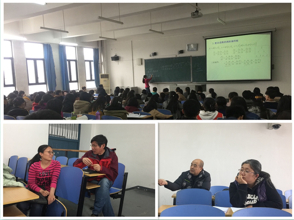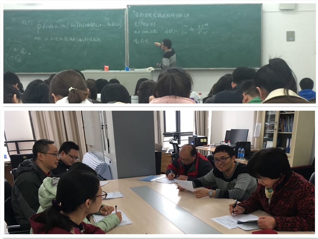 何敬副教授讲授了2016级本科生课程《高等数学II》中的“多元复合函数微分法”;郭志辉教授讲授了2015级本科生课程《数学物理方法》中的“留数定理”。两位任课教师备课充分,教学过程中关注教学问题情境的创设,注重学生的自主探索。通过介绍该门课程在物理学中的应用,使得学生在学习过程中更有学习动力和目标性。课后,听课教师与两位教师进行交流,在总结优点的同时也提出了诚恳建议,双方受益匪浅。