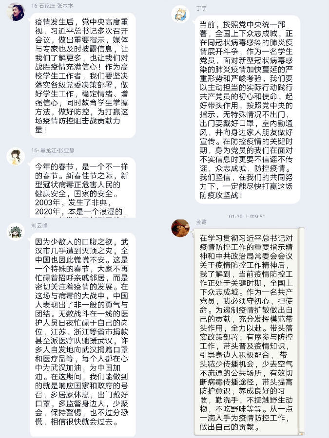 疫情就是命令,防控就是责任。自新型冠状病毒感染的肺炎疫情爆发以来,色中色 2016级学生支部36名党员认真贯彻落实党中央和学校的各项精神指示,在防控工作中以理论学习、服务社区村镇、包联班级学生等多种方式践行初心使命,接受考验洗礼,充分发挥出党支部战斗堡垒作用和党员先锋模范作用。