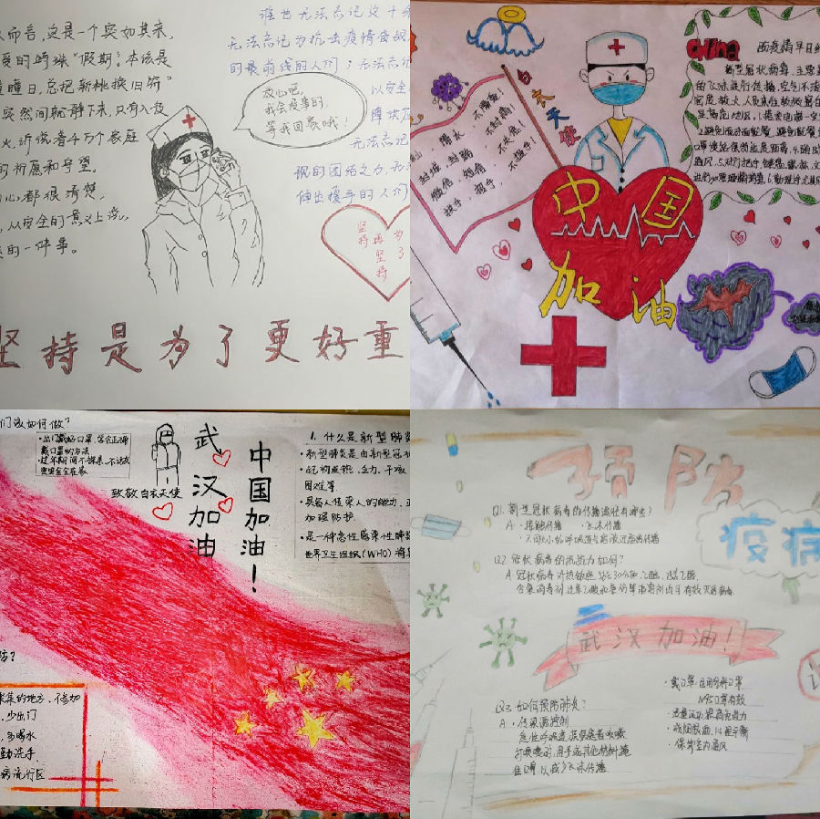 此外,大家用制作视频、倾情演唱、画手抄报等生动新颖的方式,表达他们对打赢这次疫情防控阻击战的必胜信念,祝福奋战在一线的工作人员和白衣天使身体健康,凯旋归来,期盼全国人民疫情期间做好防护,科学应对,不信谣,不传谣,为打赢疫情防治攻坚战奉献自己的青春力量。