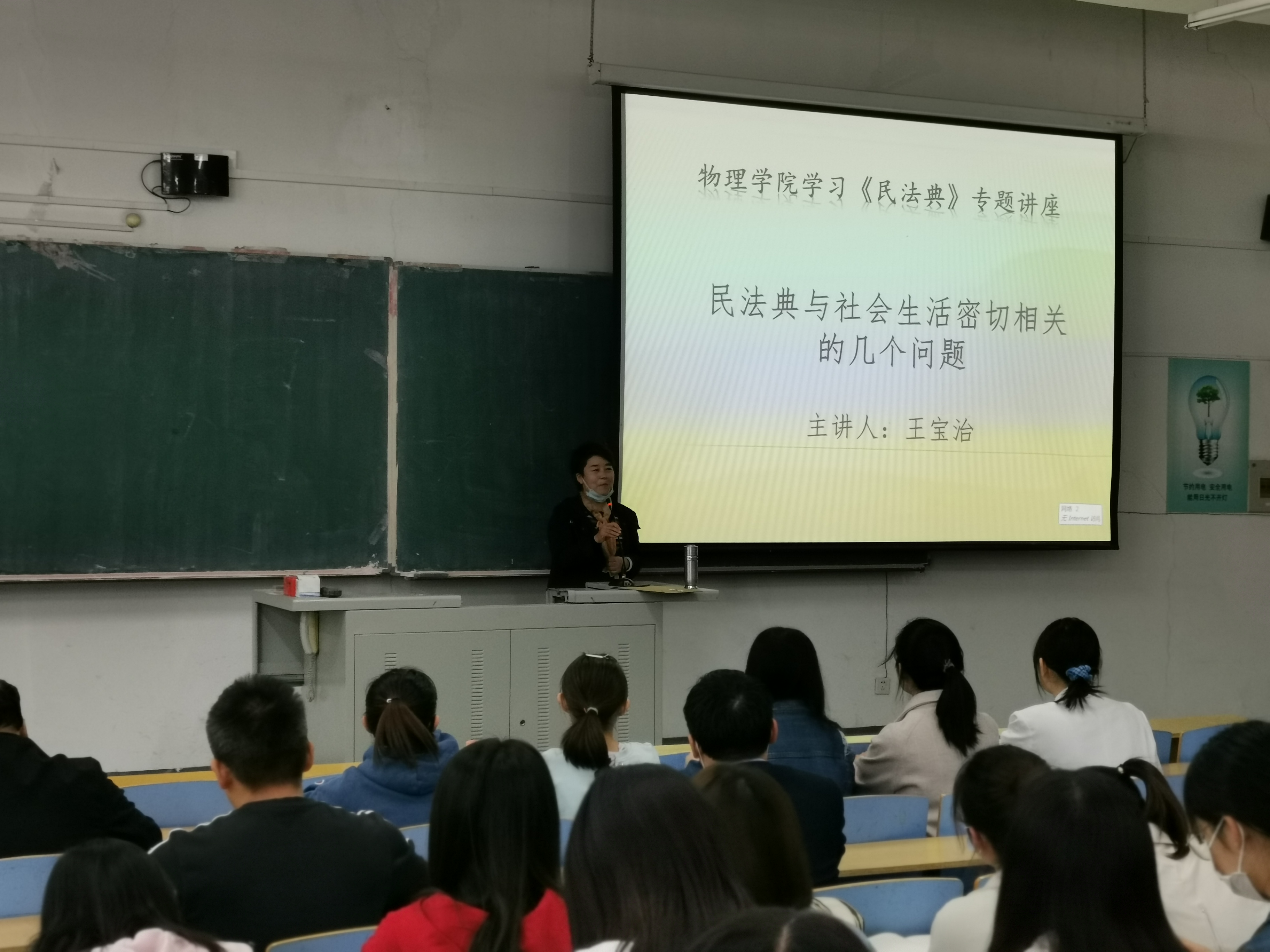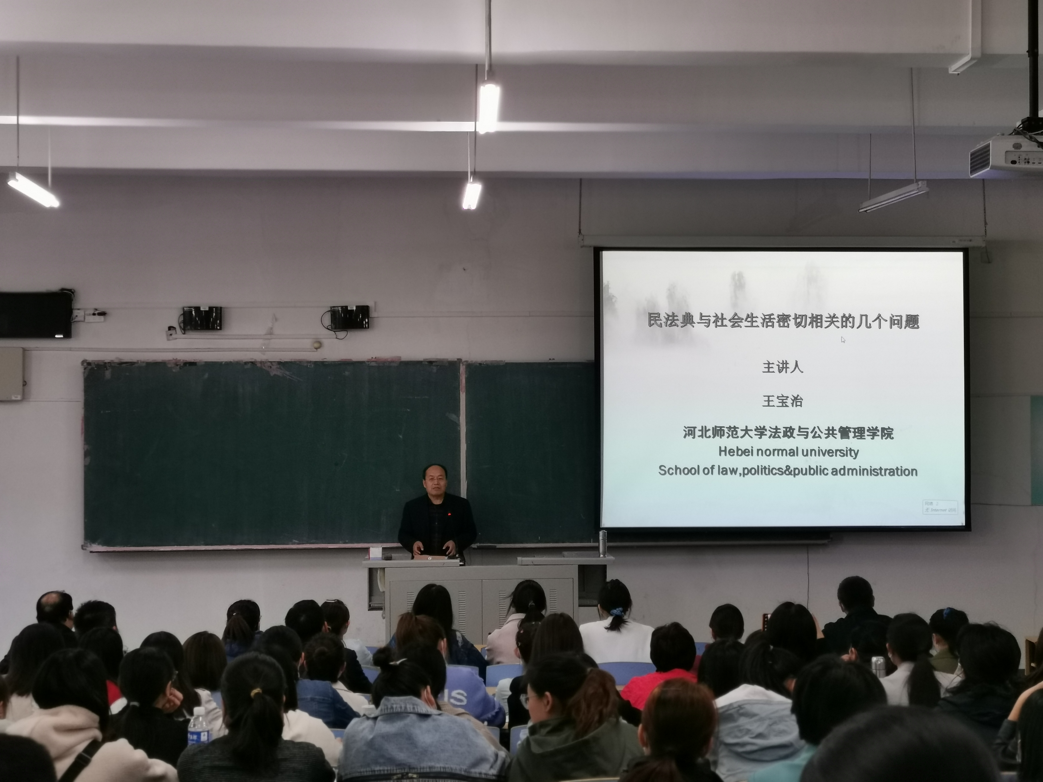 王宝治教授对民法典概述、民法典颁布实施的时间、结构和意义等方面对《民法典》进行了解读,讲解了民事主体、配偶权、亲权、亲属权、财产权和婚姻权在居民生活中的重大意义。他指出,《民法典》的颁布实施开启了我国公民权利保护的崭新时代,充分体现了人民的需求,保障了人民的权利。他以法律条文联系实际,以案示法、依法论事,对涉及民事主体、民事权利和民事责任方面的相关条款做了深入浅出、通俗易懂的讲解,让师生更深入的了解《民法典》,进一步增强了法治意识,提高了运用《民法典》的能力。